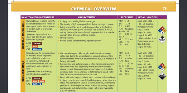 16 common chemicals encountered that include: initial isolation distances, chemical/physical properties, IDLH, placarding and more......