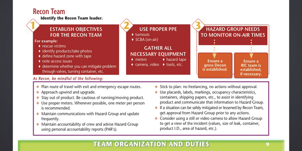 Establish the Hazard Group Leader, who will then assign their teams to the needed areas (Research, Decon, Entry, etc). Each Team will then use the reminder checklist so all aspects of their functioning portion of the incident are thoroughly covered. The checklists will develop strong leaders in each area, cover all safety aspects, and allow the Teams to operate smoothly together during the incident.